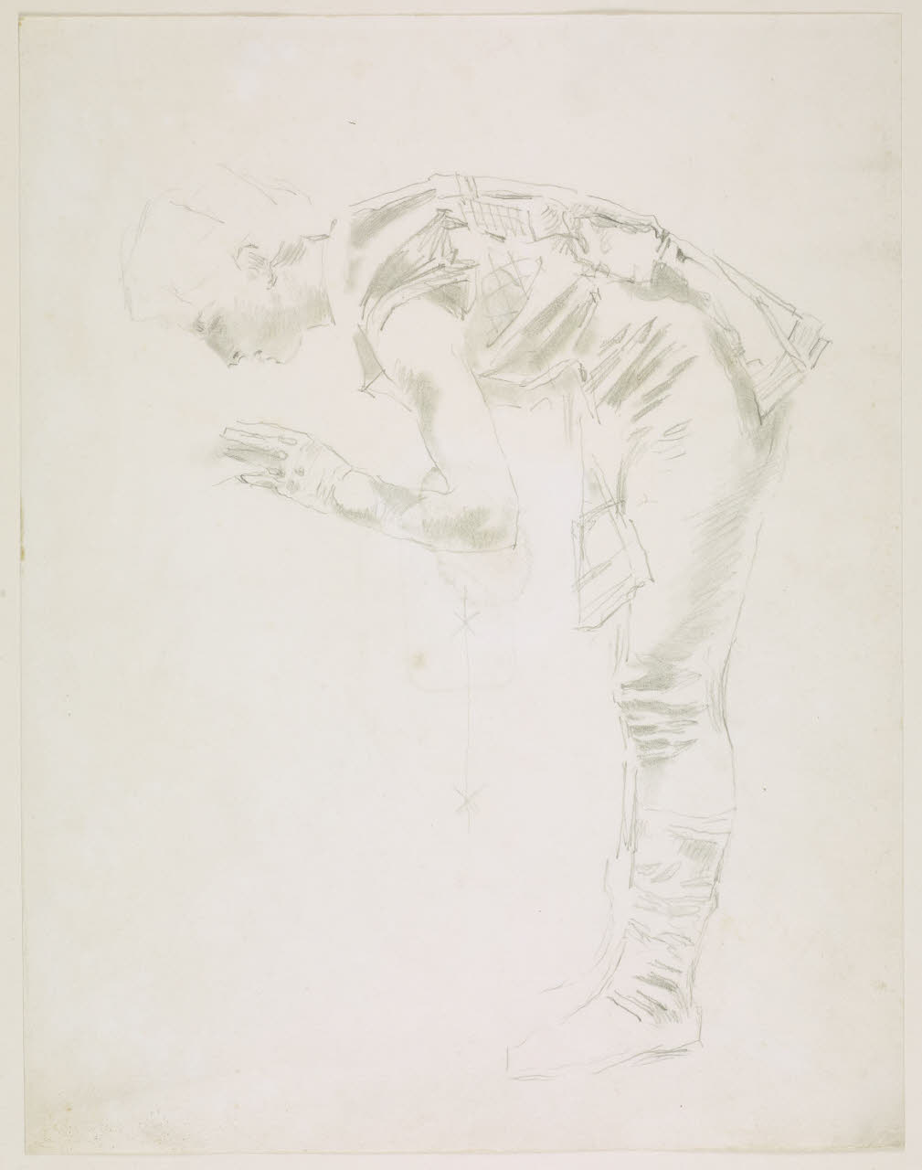 - NOTIZIE STORICO CRITICHE Questo foglio di Luigi Conconi, acquistato dal Comune di Milano nel 1931 presso il signor Nino Zucchi, illustra la figura di un giovane di profilo verso sinistra e piegata in avanti mentre, pare, si appresti ad accarezzare gentilmente con la mano guantata qualcosa o qualcuno. La figura occupa quasi completamente la superficie del foglio, sia in altezza che in larghezza, e gli sfumati a matita dettagliano le pieghe degli abiti e l'espressione dolce del ragazzo.Tipica della poetica di Conconi è la lunga figura, delicata e contorta al tempo stesso, che compie gesti eleganti e affascinanti. A differenza del suo maestro Tranquillo Cremona, Conconi preferì mantenere la rigida costruttività disegnativa dei contorni ma, come lui, indugiò nell'elegante sentimentalismo che rimarrà una componente fondamentale della sua arte.
