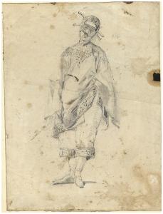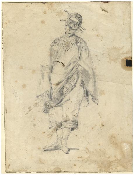 - NOTIZIE STORICO CRITICHE Il disegno, appartenuto alle collezioni di Vittore Grubicy, ritrae una figura stante con il volto parzialmente coperto da una maschera, vestita di un ampio costume decorato ai bordi. Lo studio ha evidenti affinità tematiche con altre opere del Cremona come le due "Mascherine", "Bersaglieretta", "Pagliaccetto" (Bossaglia 1994, cat. 45-48) e "Al veglione della Scala" databili 1863-1864 circa (Bossaglia 1994, cat. 42-42). \nInoltre, l'opera in esame condivide con questi lavori lo stile dai contorni precisi delle figure che le isolano dall'ambiente circostante, attestandosi così come ulteriore documento della prima attività milanese di Tranquillo Cremona quando, ancora giovane, è impregnato dell'insegnamento accademico ricevuto prima a Venezia e poi proseguito a Brera.