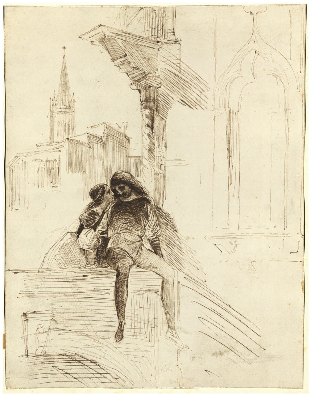 - NOTIZIE STORICO CRITICHE Già appartenuto alla collezione Luccardi, questo disegno di Tranquillo Cremona illustra un giovane in costume medievale seduto sul parapetto di una scala, mentre una giovane, pure in costume, si appoggia alla sua spalla. Nello sfondo si vede il particolare di un'architettura medievale e una chiesa. Il soggetto risente della pittura in costume cara al Romanticismo, sulla falsariga hayezziana (Bossaglia 1994). Come sovente nella produzione grafica di Cremona, il gruppo di figure è ben dettagliato, mentre gli elementi di contesto sono solo accennati con rapidi tratti, creando una sorta di non-finito, caratteristica questa che fu molto contestata dalla critica contemporanea.