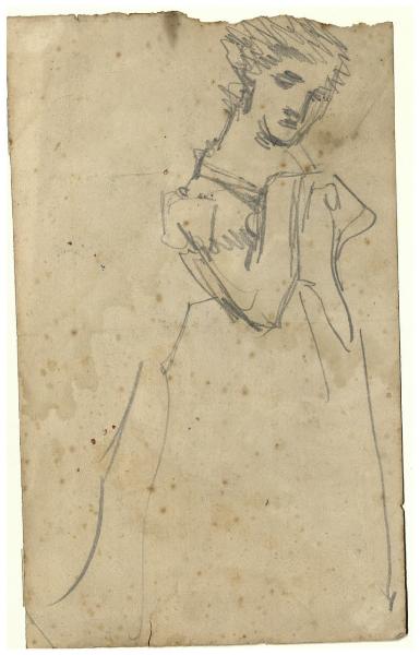 - NOTIZIE STORICO CRITICHE Questo schizzo di Tranquillo Cremona di una figura femminile si caratterizza per il segno sicuro, ma ancora nervoso del tratteggio, tipico della prima produzione dell'artista. Con pochi segni, ma precisi, Cremona riesce a rendere l'espressione malinconica e allo stesso altera della donna. Probabilmente si tratta di uno studio per un ritratto di commissione non identificato, che potrebbe risalire ai primi anni Sessanta dell'Ottocento.