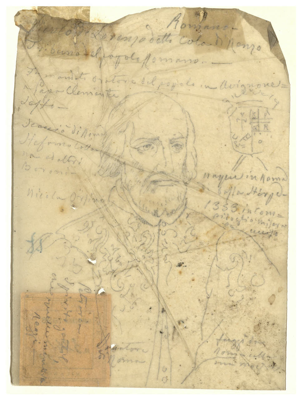 - NOTIZIE STORICO CRITICHE Già appartenuto alla collezione di Luigi Conconi, questo disegno di Tranquillo Cremona raffigura il ritratto a mezzo busto del condottiero medievale Cola di Rienzo, al secolo Nicola di Lorenzo Gabrini. L'effigie è derivata nello stesso verso dall'illustrazione incisa contenuta ne "Ritratti et elogii di capitani illustri" (p. 32) di Giulio Roscio, volume pubblicato a Roma nel 1635. L'artista appuntò inoltre attorno al ritratto alcune notizie biografiche del personaggio desunte dall'elogio di Roscio; alcune delle iscrizioni presenti sul foglio recano indicazioni di colori, probabilmente per una trasposizione pittorica del soggetto. Durante gli anni della sua formazione, ricevuta prima a Venezia e poi a Milano, Cremona si esercitò lungamente attraverso la pratica del disegno: nota è del resto l'abitudine del pittore di portare sempre con sé dei taccuini da disegno nelle sue visite a musei e gallerie (cfr. L. Beltrami, Un maestro Tranquillo Cremona, 1837-1878, Roma 1929). Il foglio in esame fa parte di una serie di uomini illustri immortalati da Cremona a scopo documentario e destinato forse ad un'impresa mai realizzata.