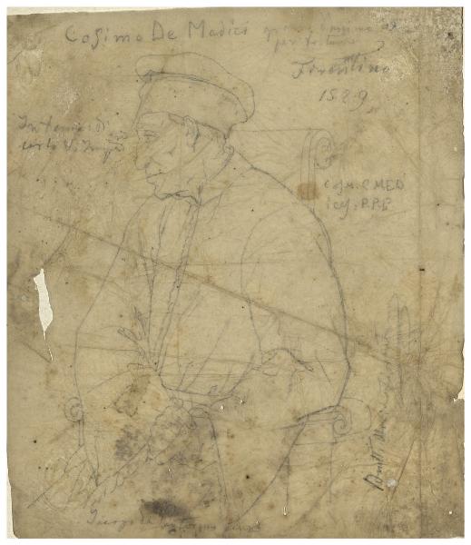 - NOTIZIE STORICO CRITICHE Già appartenuto alla collezione di Luigi Conconi, questo disegno di Tranquillo Cremona raffigura il ritratto di Cosimo il Vecchio, tratto da un dipinto di Pontormo conservato agli Uffizi. L'artista concentrò la propria attenzione sulla figura, senza curarsi degli altri dettagli presenti, come il ramo spezzato d'alloro sulla sinistra, pianta spesso usata come simbolo della dinastia medicea. Durante gli anni della sua formazione, ricevuta prima a Venezia e poi a Milano, Cremona si esercitò lungamente attraverso la pratica del disegno nello studio dei grandi maestri della pittura: nota è del resto l'abitudine del pittore di portare sempre con sé dei taccuini da disegno nelle sue visite a musei e gallerie (cfr. L. Beltrami, Un maestro Tranquillo Cremona, 1837-1878, Roma 1929). Il foglio in esame fa parte di una serie di uomini illustri immortalati da Cremona.