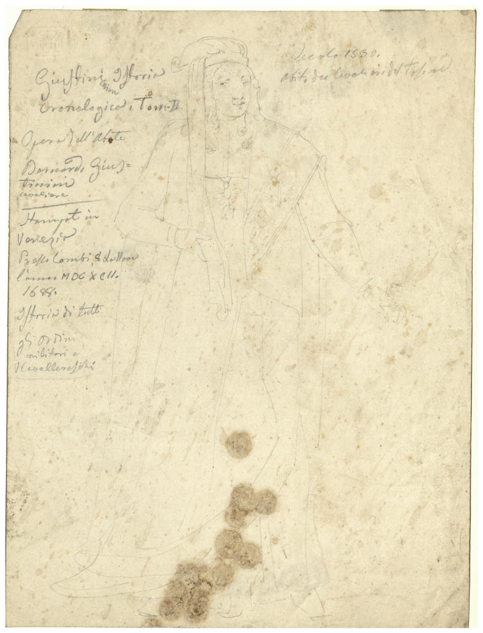 - NOTIZIE STORICO CRITICHE Già appartenuto alla collezione di Luigi Conconi, questo schizzo di Tranquillo Cremona illustra il costume dei cavalieri del Toson d'oro, riconoscibile per il tipico collare indossato dal personaggio. Cremona derivò questa figura nello stesso verso, forse ricalcandola, dalla tavola calcografica contenuta nel secondo volume delle "Historie cronologiche dell'origine degl'ordini militari e di tutte le religioni cavalleresche..." di Vincenzo Giustiniani del 1692, come lo stesso artista appuntò sulla sinistra del foglio. Durante gli anni della sua formazione, ricevuta prima a Venezia e poi a Milano, Cremona si esercitò lungamente attraverso la pratica del disegno: nota è del resto l'abitudine del pittore di portare sempre con sé dei taccuini da disegno nelle sue visite a musei e gallerie (cfr. L. Beltrami, Un maestro Tranquillo Cremona, 1837-1878, Roma 1929). Il foglio in esame fa parte di una serie di uomini illustri immortalati da Cremona a scopo documentario e destinato forse ad un'impresa mai realizzata.