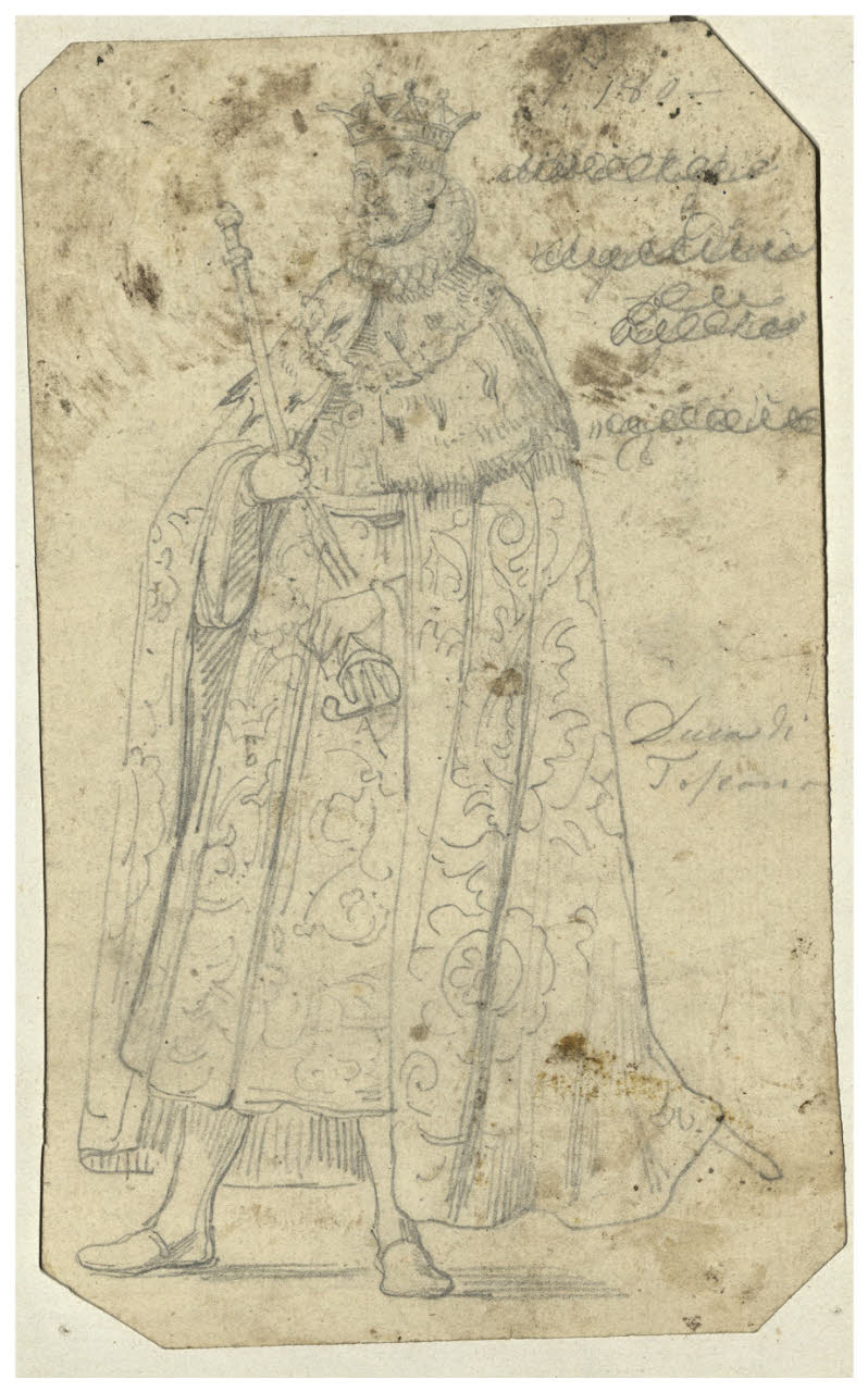 - NOTIZIE STORICO CRITICHE Già appartenuto alla collezione di Luigi Conconi, questo disegno di Tranquillo Cremona raffigura un non meglio specificato Duca di Toscana in abito da cerimonia. Lo stile grafico è estremamente attento al dettaglio storicista e appare influenzato dall'insegnamento di Giuseppe Bettini ricevuto dal Cremona all'Accademia di Brera. Il foglio è stato ritagliato agli angoli come altri due del fondo Conconi (2187/31 e 2187/33).