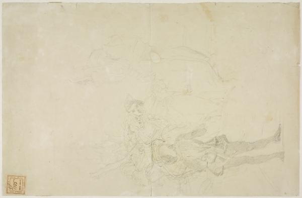 - NOTIZIE STORICO CRITICHE Già appartenuto alla collezione del pittore e incisore Luigi Conconi, questo disegno di Tranquillo Cremona è una prima idea per l'acquarello noto con il titolo "Al veglione della Scala, 1863-1864", oggi in collezione privata. Eseguito a matita, il foglio rappresenta alcune figure di maschere ebbre che si stagliano su un fondo neutro e l'artista concentra la propria attenzione su alcuni dettagli, in cui si riconoscono chiaramente il personaggio in primo piano di spalle, le due donne che si sorreggono reciprocamente, il personaggio mascherato da cinquecentista e la maschera dell'abatino. La figura di donna distesa ubriaca sul pavimento è lasciata allo stadio di rapido schizzo, mentre nessun elemento di contesto è inserito dall'artista nella composizione. L'opera finale ad acquarello ricevette un'aspra condanna da parte di certa critica che ne lamentava l'abolizione del disegno per incapacità tecnica dell'autore: per contrastare i delatori di Cremona, Chirtani propose sulla copertina de l'"Illustrazione Italiana" del 7 marzo 1886 l'incisione di Ambrogio Centenari d'après l'opera di Cremona, sottolineando "il contorno preciso e la massa d'ombra scritta e squadrata" (Bossaglia 1994, p. 108).