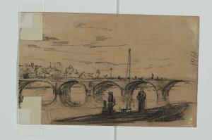 - NOTIZIE STORICO CRITICHE Appartenuto a Grubicy De Dragon il disegno fu realizzato dal pittore olandese Théophile de Bock. Sul recto è rappresentata la Spiaggia con barche a vela dello stesso autore; sul verso, i veloci tratti a carboncino delineano le architetture del ponte e delle case alle sue spalle, lasciando in primo piano due figure accennate sulla battigia intente a osservare il paesaggio dinanzi a loro.\nConsiderando che non esistono più contatti diretti tra il pittore e Grubicy dopo il ritorno di quest'ultimo in Italia, il disegno fu quasi certamente eseguito tra il 1882 e il 1886, anni in cui Grubicy era in Olanda.
