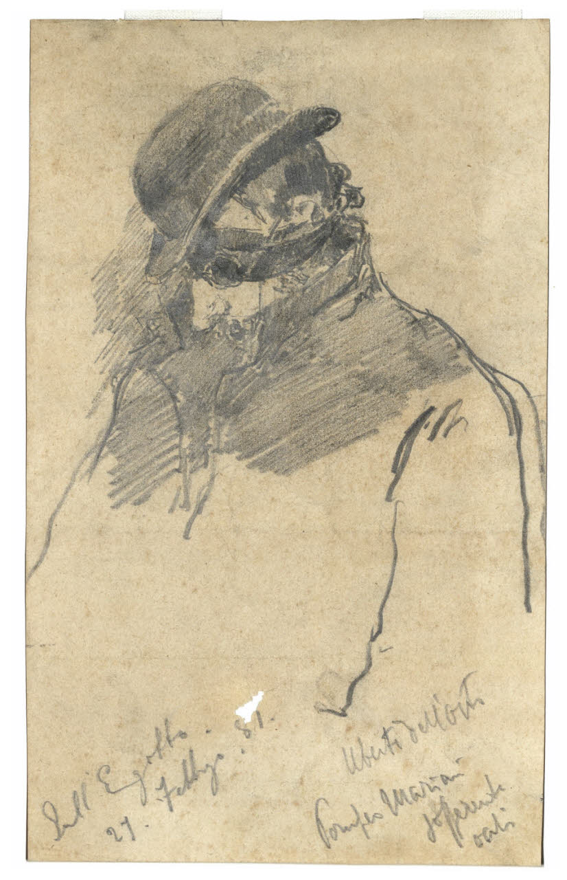 - NOTIZIE STORICO CRITICHE Nel 1880 Uberto Dell'Orto propose all'amico Pompeo Mariani un viaggio in Egitto per arricchire le loro esperienze pittoriche insieme a Sallustio Fornara. Alla fine dell'autunno di quell'anno i tre si imbarcano a Brindisi alla volta di Alessandria d'Egitto. Nel febbraio del 1881, mentre stava dipingendo all'aperto, Pompeo Mariani viene investito da una folata di sabbia che lo ferì all'occhio destro, costringendolo a fare rientro in Italia. Questo ritratto di Pompeo Mariani sofferente agli occhi, firmato da Dell'Orto e datato 27 febbraio 1881, resta a testimonianza delle esperienze del viaggio e del soggiorno in Egitto che i due artisti condivisero. Mariani è presentato a mezzo busto di tre quarti verso sinistra in un pesante paltò con il bavero rialzato e Dell'Orto indugia nella rappresentazione del volto dell'amico pittore, costretto ad indossare una benda e un paio di occhiali dopo l'incidente. Il disegno, appartenuto alla collezione di Pompeo Mariani, suggerisce con velocità e sicurezza le forme sintetiche del soggetto, non senza un certo gusto caricaturale derivante dall'osservazione diretta.