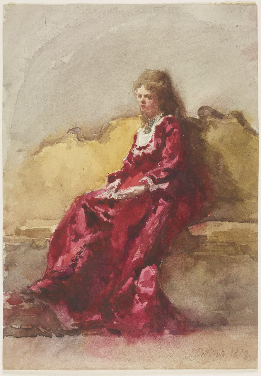 - NOTIZIE STORICO CRITICHE Già appartenuto alla collezione di Pompeo Mariani, questo acquerello, firmato e datato da Uberto Dell'Orto nel 1879, illustra una donna in abito rosso seduta su un ampio divano. Il bel modellato e il colore vivace nel contrasto tra il fondo grigio, l'ocra del divano e il vermiglio dell'abito, collaborano ad un'evocazione dell'ideale femminile lombardo dell'ultimo quarto del XIX secolo, di stampo ancora scapigliato e in netto contrasto con la preoccupazione fotografica della somiglianza che dominava nella pittura di quel tempo.\nDopo un'iniziale formazione ricevuta con Lelli e Pagliano, Dell'Orto frequentò la scuola serale di nudo presso l'Accademia di Brera e quella di costume presso la Famiglia Artistica, prima di aprire nel 1880 il proprio atelier in via Agnello ed è proprio a questo periodo giovanile dell'artista che si deve riferire l'opera in esame.