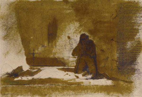 - NOTIZIE STORICO CRITICHE Già appartenuto alla collezione di Pompeo Mariani, questo disegno di Federico Faruffini è da mettere in relazione con due dipinti a olio dello stesso soggetto, uno conservato presso la Civica Galleria d'Arte Moderna (inv. 5002) e l'altro di ignota ubicazione. Un uomo con il costume da saltimbanco è inginocchiato in preghiera davanti al corpo senza vita di una giovane, parzialmente coperta da un lenzuolo. I tocchi a matita disegnano rapidamente e leggermente i contorni delle figure e degli oggetti, mentre il carboncino e le pennellate ad acquarello rendono gli effetti chiaroscurali. L'insistenza sul tema della morte lascia supporre che questo disegno sia stato eseguito durante gli ultimi anni del pittore ed è possibile che Faruffini conoscesse, attraverso incisioni, l'"Arabo che copre il cadavere di un amico" di Mariano Fortuny e che ne trasse liberamente spunto, adattando il soggetto in modo da alludere alla sua situazione personale (Finocchi 1989, p. 164), che culminò con il suicidio a Perugia nel 1869.