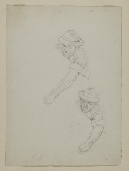 - NOTIZIE STORICO CRITICHE Il foglio si ricollega da vicino a un disegno conservato presso il Museo Civico Giovanni Fattori di Livorno (inv. 1757/91) e datato 1882. È un primo studio per la figura di un buttero inginocchiato che trattiene la zampa posteriore di un puledro, uno dei molti personaggi che animano la Marcatura dei puledri (1887; collezione privata), di cui sopravvivono due bozzetti e numerosi disegni preparatori. L'interesse per i butteri nacque dal soggiorno di Fattori presso la tenuta del principe Corsini alla Marsiliana, in Maremma, e caratterizzò parte della produzione degli anni Ottanta dell'autore.