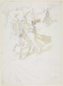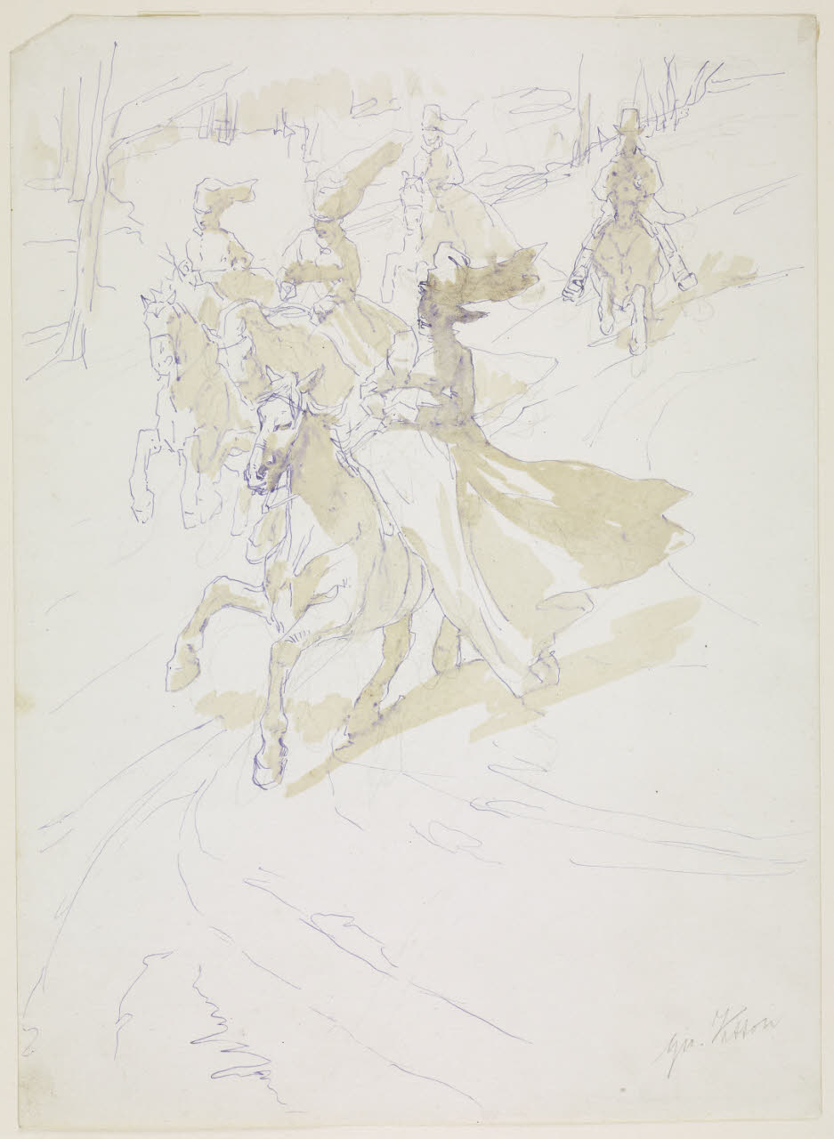 - NOTIZIE STORICO CRITICHE Pur non riconducibile con esattezza a un dipinto di Fattori, il disegno mostra similitudini, di carattere compositivo e iconografico, con alcune scene di cavalieri al galoppo. In particolare, in Cavalcata di soldati nel bosco (Novara, Galleria d'Arte Moderna Paolo e Adele Giannoni) è ripresa la diagonale dei cavalieri al galoppo che taglia la scena e l'ambientazione. Rispetto ai molti dipinti, tuttavia, il disegno presenta una serie di personaggi a cavallo dal particolare abbigliamento: berretto con un lungo velo sulla nuca e una sorta di coperta che sembra riparare dalle intemperie gli uomini. È probabile che il disegno sia un primo pensiero per un motivo, quello dei soldati al galoppo, che conobbe grande fortuna nelle diverse interpretazioni e declinazioni che ne diede Fattori.