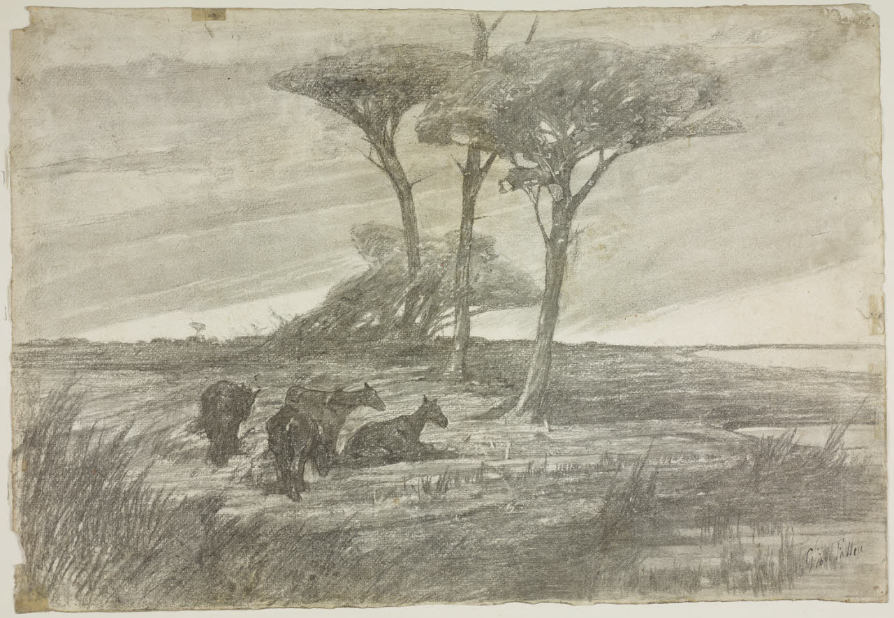 - NOTIZIE STORICO CRITICHE Il motivo dei cavalli bradi, al galoppo in una pineta o al riposo in riva al mare, è stato affrontato molte volte da Fattori in pittura, ad esempio ne I cavalli bradi nella pineta di Tombolo, soprattutto negli anni della maggiore adesione alle ricerche dei macchiaioli. Il disegno, tuttavia, da un punto di vista stilistico, si avvicina all'opera tarda dell'autore, in cui il segno nitido cede il posto a tecniche diverse, tra cui il carboncino, con cui reinterpreta "il paesaggio desolato o un cavallo stanco, con poetica ormai venata da inflessioni esistenziali, proiettata nel nuovo secolo" (A. Baboni, I disegni di Giovanni Fattori del Museo Civico di Livorno, in L'Ottocento: i disegni di Giovanni Fattori, a cura di A. Baboni, p. 12).