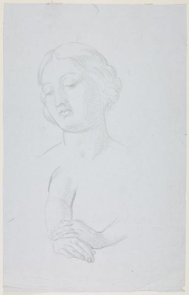 Schizzo di una testa femminile e di due mani