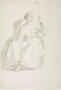 Studio di figura femminile seduta appoggiata a un bastone