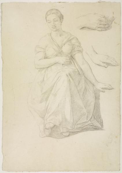 Studio di figura femminile seduta e studi della posa delle mani