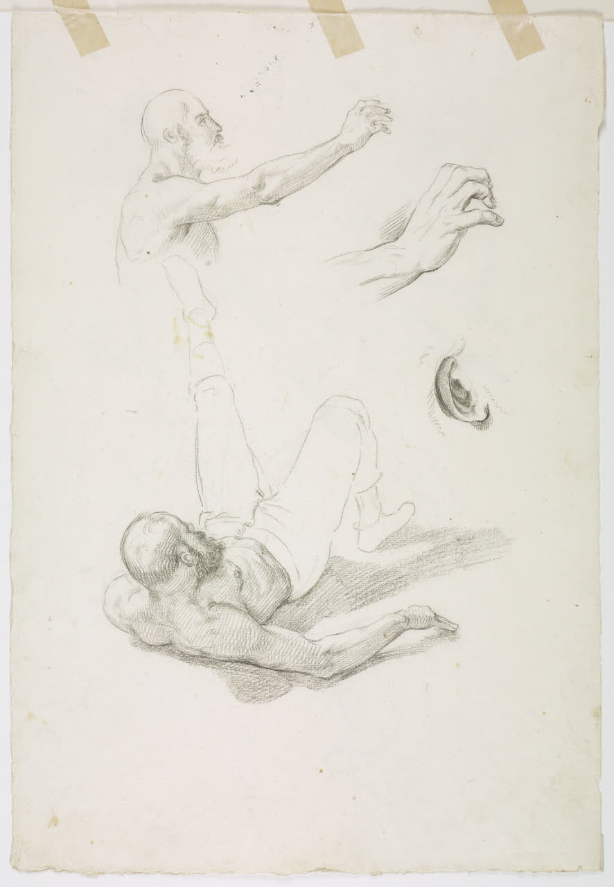 Studio di figura maschile semisdraiata, di figura maschile con braccio teso, e studio della mano e dell'orecchio