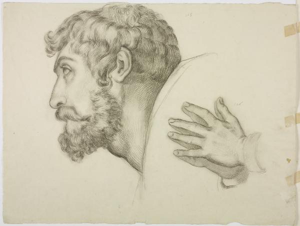 - NOTIZIE STORICO CRITICHE Allievo a Brera del pittore fiorentino Luigi Sabatelli dal 1832 al 1836, durante la sua formazione Fumagalli copiò probabilmente alcune opere del suo maestro Luigi e del figlio dell'artista, Francesco. Gli studi del foglio in questione derivano difatti dalla figura del condottiero Ezzelino da Romano nel cartone preparatorio (GD: Au. 6071/1) raffigurante "Ezzelino da Romano ai piedi di sant’Antonio" (1825 ca.), realizzato da Francesco Sabatelli per l'affresco di una delle due lunette della cappella di sant'Antonio presso la chiesa di Santa Croce a Firenze.