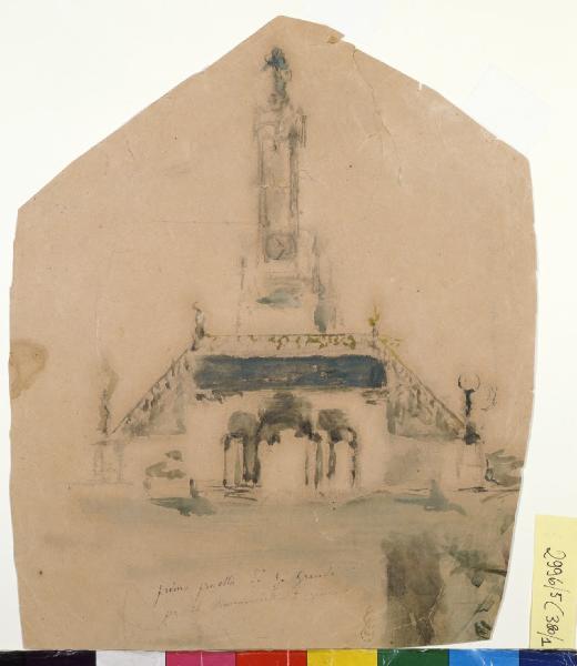 - NOTIZIE STORICO CRITICHE Nel 1879 la municipalità di Milano indisse un concorso pubblico per realizzare il Monumento alle Cinque Giornate di Milano, a ricordo degli avvenimenti del 1848. Il monumento doveva sorgere in piazza di Porta Vittoria, dove un tempo si apriva nei bastioni spagnoli una porta, rifatta dal Piermarini nel 1870. La commissione pubblicò così il primo concorso rivolto ai bozzetti architettonici nel 1880 e le risorse finanziarie per realizzare l’opera sarebbero state reperite tramite una sottoscrizione pubblica. La giuria si orientò verso il progetto dell’architetto Luca Beltrami, ma i lavori non vennero avviati e nel marzo 1881fu indetta una nuova gara. Giuseppe Grandi partecipò con un progetto di tipo scultoreo, aggiudicandosi la commissione che gli fu assegnata ufficialmente nel gennaio 1882. In questo foglio, con il quale l'artista aveva partecipato al primo bando del Concorso (3 giugno 1879), ma venne scartato, Grandi immaginò un primo progetto per il monumento che prevedesse un obelisco eretto in cima ad una balconata, a doppia rampa di scale e con arcate sottostanti. Questo progetto, che doveva andare a sostuire la vecchia porta Tosa, poi ribattezzata Porta Vittoria, perchè decisivo baluardo conquistato dai milanesi contro gli austriaci, venne in seguito abbandonato in favore del progetto vincitore, poi realizzato.