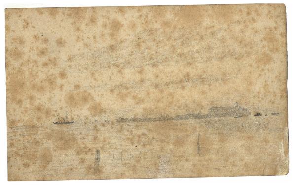 - NOTIZIE STORICO CRITICHE Nell'estate del 1897 si era svolta la seconda Esposizione Internazionale di Venezia, alla quale Vittore Grubicy prese parte con tre dipinti. In quella circostanza, l'artista si era recato nella città lagunare e vi si trattenne per un breve periodo di soggiorno, durante il quale realizzò numerosi disegni, per la maggior parte colti dalla sponda del lido e orientati in direzione della città (Rebora, 1995). Lo sviluppo orizzontale della composizione e i pochi tratteggi per la resa atmosferica del cielo connotano questo disegno, realizzato con una estrema semplificazione dei mezzi espressivi.