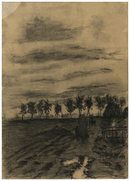 - NOTIZIE STORICO CRITICHE Accanto alle prove ad olio eseguite nelle Fiandre, Vittore Grubicy eseguì alcuni paesaggi a carboncino caratterizzati da un tratto marcato e robusto nella resa dei contrasti tra le zone in luce e quelle in ombra, di cui fa parte anche il disegno in esame con una campagna alberata.
