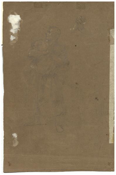 - NOTIZIE STORICO CRITICHE Tra i numerosi studi preparatori eseguiti da Francesco Hayez per la grande tela intitolata "La distruzione del Tempio di Gerusalemme" del 1867, si annovera anche questo foglio che presenta al verso un uomo stante, lo studio di mani congiunte e il rapido schizzo di un ginocchio. Questi studi devono essere messi in relazione con la figura dell'imperatore Tito, posto davanti e al centro della composizione dipinta, ritratto con la tunica bianca e il mantello rosso. Neppure l'imperatore riesce a fermare il massacro e la furia distruttiva dei soldati romani intenti a devastare e saccheggiare ogni cosa, costringendolo ad assistere impotente alla scena sui gradini del Tempio. Isolato rispetto alla moltitudine di altri personaggi, Tito porta le mani congiunte davanti al petto, mentre si allontana, volgendosi all'indietro per un ultimo sguardo desolato allo scenario di distruzione. In questo foglio Hayez si concentra con attenzione su questa figura, non solo nella sua posizione, con lo studio dei particolari delle mani e del ginocchio, ma anche nel suo atteggiamento di estremo sconforto. I piccoli tratteggi a gessetto bianco lumeggiano infine alcuni particolari. Il disegno in esame, assieme a quelli da tempo noti presenti nelle collezioni delle Gallerie dell'Accademia di Venezia e in quelle dell’Accademia di Brera, testimoniano proprio la complessità dell’elaborazione del dipinto che impegnò l'artista alcuni anni e l’evolversi dei progressivi aggiustamenti e modifiche.