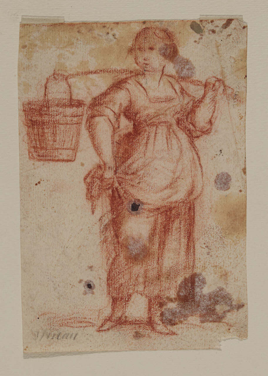 - NOTIZIE STORICO CRITICHE Appartenuto alla collezione di Paolo Gaffuri, questo disegno di Johann Anton Eismann illustra una contadina che regge un secchio sulla spalla. Il foglio faceva probabilmente parte, come i disegni Au. A 1409, A 1410 e A 1412, di un taccuino di viaggio, nel quale l'artista vi registrava studi dal vero, sfruttati poi per diverse macchiette che compaiono nelle sue tele.