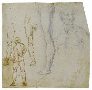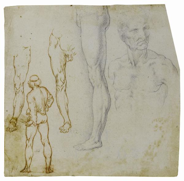 - NOTIZIE STORICO CRITICHE Pur nelle sue piccole dimensioni il foglio - ascrivile alla bottega di Leonardo - è servito come supporto per la registrazione di diversi studi, alcuni copia da disegni originali del maestro. Al recto: i modelli per le due gambe a sinistra possono rintracciarsi in altrettanti disegni oggi nelle collezioni reali britanniche a Windsor Castle (inv. 919130v. e 919136v., circa 1490); la gamba a matita nera al centro del foglio è copiata da uno studio conservato a Londra al British Museum (inv. 1886,0609.41, 1506-1510 circa); la figura di spalle che brandisce qualcosa nella mano sinistra è derivata, ancorché in maniera speculare, da due disegni della Biblioteca Reale di Torino, entrambi in relazione con la Battaglia di Cascina (inv. 15577 D.C. e inv. 15650 D.C.; 1505-1508 circa). Infine nel busto maschile sulla destra si vede il riflesso di alcuni studi tardi sull'anatomia di un vecchio, sempre a Windsor Castle (inv. 919003r. e 919001v.), del 1510-1511. \nDesta interesse nella parte sinistra del disegno la tecnica esecutiva, con una prima stesura a matita rossa che poi è stata sommariamente ripassata a penna. Tale traccia è ben riconoscibile nella figura di spalle ma è presente anche nella gamba a destra di questa, un dettaglio che si caratterizza per l'ombreggiatura dall'andamento sinistrorso, tratto peculiare dell'opera grafica di Leonardo. In questa prima stesura a matita rossa potrebbe forse leggersi un intervento di mano del maestro rinforzato da un allievo, come si vede in diversi suoi disegni. Così Marani 2019: "Se non fosse per la fermezza e la mancanza di vibrazione del disegno della gamba con tratteggio sinistrorso, si sarebbe quasi tentati di considerarlo la ripassatura a penna di un disegno a gessetto rosso sottostante di mano di Leonardo (?)". Al verso: in alto a matita è tracciata la scritta SALV[A]TOR MVNDI, in basso si riconosce lo studio per una manica. All'anonimo autore (o forse agli autori) del disegno va il merito di aver fissato in una sola immagine una copia di particolari anatomici e di figure che Leonardo ha elaborato in un arco temporale di almeno vent'anni e che egli metteva evidentemente a disposizione degli allievi all'interno della sua bottega, per il loro personale studio. La cronologia degli originali di Leonardo copiati al recto del foglio (databili tra il 1490 e il 1510/1511 circa) fornisce strumenti per la cronologia del nostro disegno, suggerendo una datazione poco dopo il 1510, mentre studi precedenti avevano fissato l'epoca di esecuzione del progetto iconografico del Salvator Mundi sullo scorcio del Quattrocento.\nEsposto al Castello Sforzesco di Milano dal 24 gennaio al 19 aprile 2020 (L'atelier di Leonardo e il Salvator Mundi, senza catalogo, per una lista delle opere cfr. il PDF allegato).