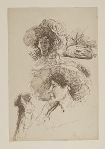 Due figure con cappello, due teste femminili con cappello e due mani congiunte