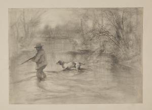 Cacciatore con cane che attraversa un corso d'acqua