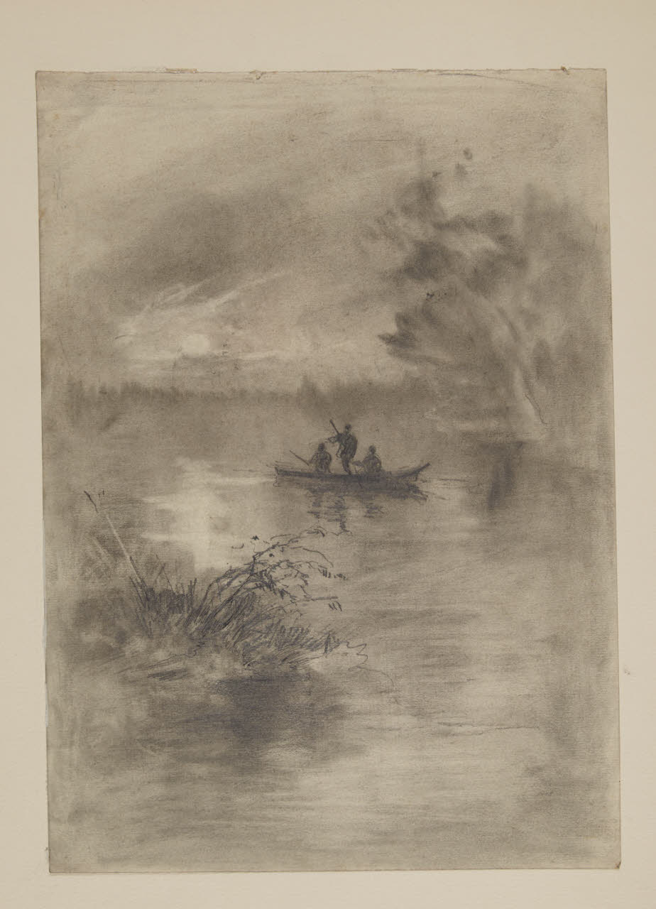 Cacciatori in barca su un corso d'acqua alle luci dell'alba
