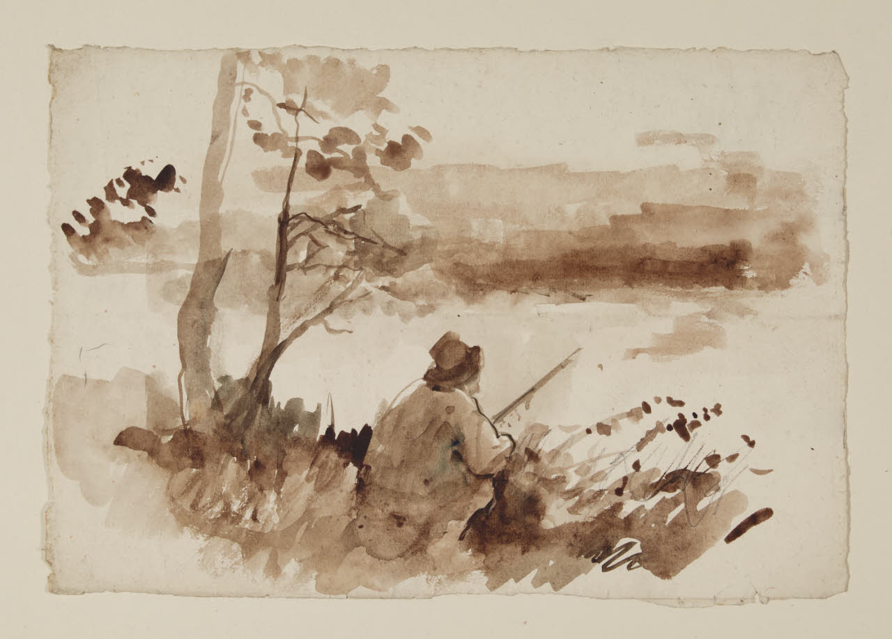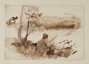 Cacciatore in attesa sulla riva di un lago