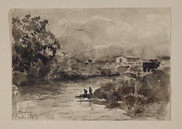 Paesaggio fluviale con alberi, casolare e macchiette sulla riva