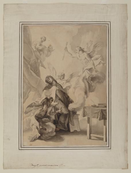 - NOTIZIE STORICO CRITICHE Prima del 1943, il disegno in esame faceva parte della collezione del Principe Alberico XII Barbiano di Belgioioso, dove venne attribuito al pittore, storico e critico d'arte tedesco Anton Raphael Mengs da Giuseppe Bossi, chiamato a stimare i beni dell'illustre collezionista milanese alla sua morte. Precerutti Garberi pubblicò il disegno a più riprese (1969; 1971) come opera di Giovanni Battista Pittoni, mentre studi più recenti di Eugenio Martini (1982; 1989) e di Ugo Ruggeri (1989) ne hanno assegnato convincentemente la paternità a Mattia Bortoloni. Databile stilisticamente al tempo della decorazione della Parrocchiale di Fratta Polesine, eseguita dal Bortoloni tra il 1734 e il 1735 nella sua piena maturità, il foglio si presenta estremamente finito in ogni suo dettaglio ed è eseguito con un'accuratissima tecnica all'acquarello a vari toni di grigio su carta rosata giallina. L'opera raffigura l'estasi di santa Teresa: quest'episodio mistico, vissuto dalla santa fondatrice dei carmelitani scalzi e narrato nella sua autobiografia, viene reso dall'artista con grande efficacia e teatralità, grazie all'adozione di un pesante drappeggio sulla sinistra del foglio ad uso di cortina e all'entrata in scena a cavallo di una nuvola dell'angelo in veste di Eros cristiano che colpirà al petto la santa con il suo dardo. Mentre due angeli in alto a sinistra osservano la scena come semplici spettatori, altri due sostengono la santa che si abbandona all'estasi. Il tavolino con un libro chiuso e il calamaio restano i soli elementi scenografici a richiamo delle meditazioni ascetiche di santa Teresa sul mistero della Passione di Cristo. Questo foglio di Bortoloni risente ancora dell'influenza del suo primo maestro Antonio Balestra, e si può avvicinare ad un altro disegno attribuito allo stesso artista raffigurante l'Annunciazione, in collezione privata (cfr. Martini 1989, p. 41). Non andrà neppure trascurato l'ascendente del conterraneo Sebastiano Ricci che lasciò l'Estasi di Santa Teresa nella chiesa di San Girolamo degli Scalzi di Vicenza attorno al 1724, dal quale deriva il motivo dei due angeli che si affacciano tra ammirati e divertiti dall'alto della scena. Alla ricerca di movimento del Ricci, il Pittoni preferì un'equilibrata disposizione a piramide rovesciata e ha come vertice la figura di Santa Teresa.