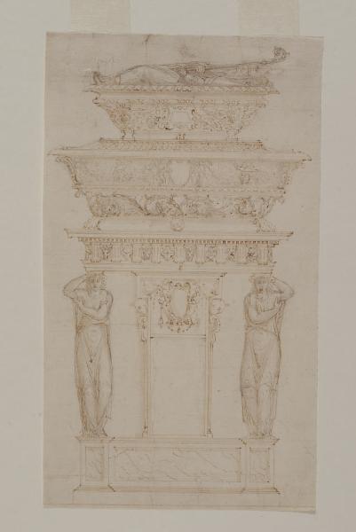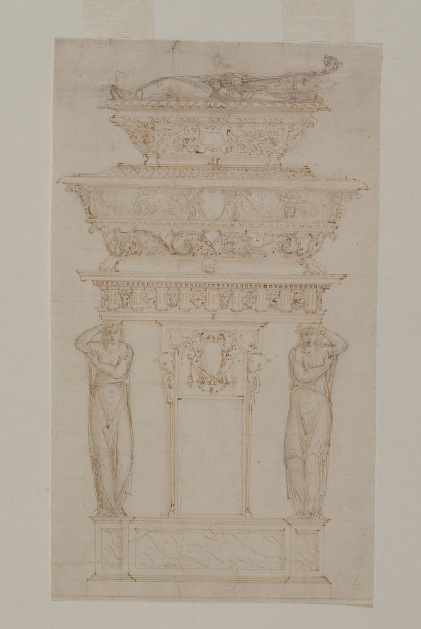 - NOTIZIE STORICO CRITICHE L'Album Tibaldi entra nelle raccolte del Civico Museo d'Arte Antica, al Castello Sforzesco, nel 1905 quando è acquistato grazie dal mercante d'arte Julius Böhler di Monaco. L'album Tibaldi aveva fatto parte della collezione di Carlo Morbio (1811-1881), nato a Novara ma stabilitosi fin da giovane a Milano. Infatti nel Catalogo ragionato ed illustrazione degli autografi e dei ritratti di celebri personaggi dal risorgimento delle lettere insino a noi raccolti e posseduti dal cav. Carlo Morbio. (Milano, 1857, p. 97) e ancora nelle Opere Storico-Numismatiche di Carlo Morbio (Bologna, 1870, p. 186) è lo stesso Morbio a citare la "Cartella di Pellegrino" definita una "preziosa raccolta de' suoi disegni originali". È probabile sia stato soprattutto il fraintendimento del monogramma PPAM (inscritte in un cuore sormontato da una croce), all'epoca interpretato appunto come firma di Pellegrino Pellegrini, ad aver portato il conoscitore e chi dopo di lui ebbe modo di vedere e valutare i disegni all'errata attribuzione al Tibaldi. Dopo la morte del Morbio, la figlia Giulia, moglie dell'imprenditore tessile Benigno Crespi, cede gran parte della collezione paterna al libraio Theodor Ackermann che la vende in varie aste a Lipsia, in Germania. È questa probabilmente la ragione dell'intermediazione di un altro mercante tedesco, il già citato Böhler, che permise il ritorno dei disegni a Milano. Il foglio 37 presenta il progetto di ricchissimo monumento funebre per un vescovo. Due cariatidi sostengono una mensola sulla quale poggia una prima arca che ne sostiene una seconda, di dimensioni leggermente inferiori, in cima alla quale è ritratto un vescovo supino. \nIl disegno si può mettere in rapporto con il monumento funebre del vescovo di Bobbio, Battista Bagarotti (Castello Sforzesco, inv. 1417), realizzato tra il 1517 e il 1519 (V. Zani in Museo d'Arte Antica del Castello Sforzesco. Scultura lapidea, v. III Milano, Electa, 2014). Si possono rilevare alcuni fondamentali punti di contatto tra il foglio 37 dell'album Tibaldi e il monumento conservato nelle sale del Castello che riguardano la porzione superiore del monumento. Oltre alla non comune struttura costituita da due arche sovrapposte, le decorazioni appaiono così simili da far ipotizzare una dipendenza diretta: dal basso verso l'alto, le zampe leonine e il teschio che sorreggono la prima arca e in particolare la fascia inferiore dell'arca stessa, ancora più aderente la resa scultorea del fregio immediatamente superiore con festoni e puttini. Nella decorazione dell'arca sommitale si notino invece i leoni alati (e addirittura si potrebbe insistere sulla curiosa forma arcuata delle ali). \nIl monumento oggi al Castello é commissionato da Bagarotti stesso per la cappella dell'Assunta nella chiesa francescana di Santa Maria della Pace a Milano. Quando nel 1805 la chiesa é sconsacrata, l'opera viene smontata e riassemblata nella chiesa di Sant'Angelo e, dopo un passaggio nelle raccolte dell'Accademia di Brera, approda definitivamente al Castello Sforzesco nel 1900. L'attribuzione ad Andrea Fusina, avanzata da Mongeri nel 1863 sulla base del confronto con l'unica opera certa dello scultore, la tomba di Daniele Birago in Santa Maria della Passione (firmata e datata 1495), non è stata messa in discussione per più di un secolo. Nel 1999 Vito Zani, affatto convinto dalla consonanza stilistica con l'opera di Fusina, propone di attribuire invece il monumento ad un altro scultore legato al vescovo di Bobbio: Ambrogio Montevecchia. Zani sostiene l'attribuzione sia rinforzata dal confronto delle teste di Medusa sulle sei colonnine che sorreggono la struttura con i volti delle statue dell'altare del Crocifisso del duomo di Piacenza, una delle pochissime opere attribuite (su base documentaria) a Montevecchia. \nTornando al possibile rapporto tra il foglio 37 dell'album Tibaldi e il monumento funerario, va sottolineato come gli avvenimenti seguenti la soppressione di Santa Maria della Pace possano aver portato a un assetto, successivo al rimontaggio, diverso da quello di partenza. Si guardi in particolare alla mensola sorretta dalle sei colonnine, sorprendentemente spoglia rispetto al resto dell'opera. Un ultimo appunto: un documento citato proprio da Zani testimonia la richiesta di una lapide destinata alla propria tomba avanzata da Bagarotti nei confronti della Fabbrica del Duomo; nell'attuale assetto del monumento non si rileva la presenza di alcuna lapide e nemmeno di uno spazio che potesse in passato ospitarla. Il disegno, al contrario, prevedeva una grande lapide tra le due cariatidi.