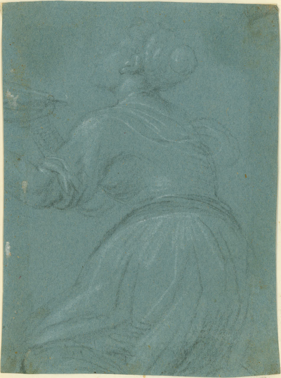 - NOTIZIE STORICO CRITICHE Il foglio è uno studio preparatorio per la figura femminile che compare in primo piano al centro nella tela raffigurante i santi Paolo e Barnaba a Listri, una delle due opere commissionate nel 1573 a Simone Peterzano da Gian Giacomo Trivulzio, conte di Melzo, per il presbiterio della chiesa milanese dei Santi Paolo e Barnaba, e ancora oggi in loco. Riconosciuto e pubblicato per la prima volta da Costantino Baroni (1944).