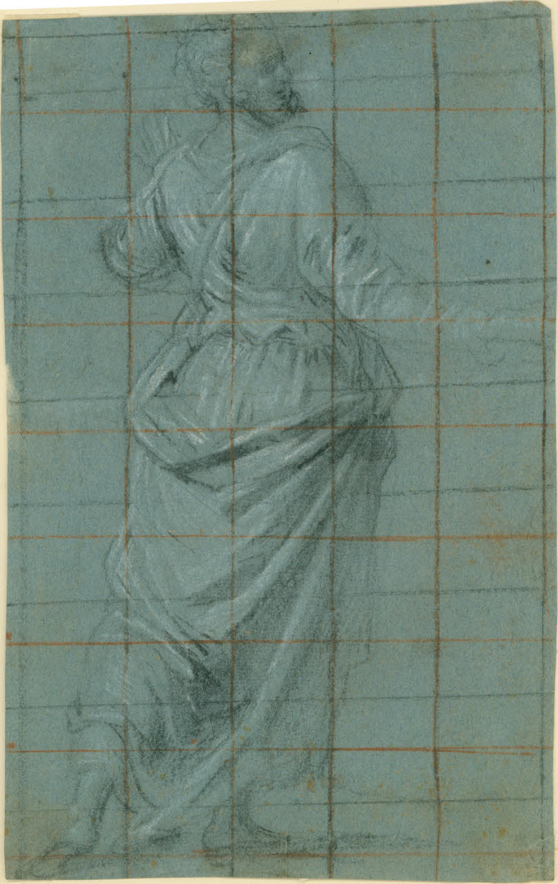 disegno su carta azzurra eseguito a pietra nera con lumeggiature a gessetto bianco; è presente anche la pietra rossa nella doppia quadrettatura del foglio