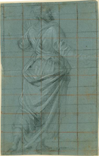 - NOTIZIE STORICO CRITICHE Il foglio è uno studio preparatorio per la figura di san Paolo nella grande tela raffigurante I santi Paolo e Barnaba a Listra, una delle due opere commissionate nel 1573 a Simone Peterzano da Gian Giacomo Trivulzio, conte di Melzo per il presbiterio della chiesa milanese dei Santi Paolo e Barnaba, e ancora oggi in loco. Riconosciuto e pubblicato per primo da Costantino Baroni (1944).