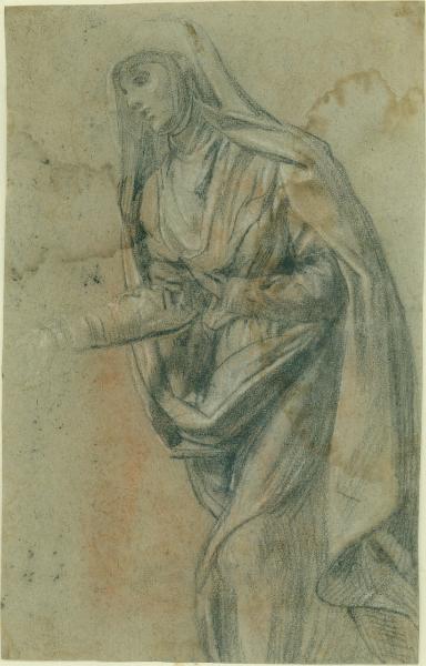 disegno su carta grigia eseguito a pietra nera con lumeggiature di gessetto bianco con tracce di pietra rossa da contatto