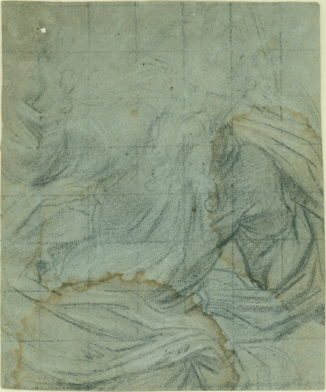 disegno su carta azzurra eseguito a pietra nera con lumeggiature di gessetto bianco, quadrettatura a pietra nera