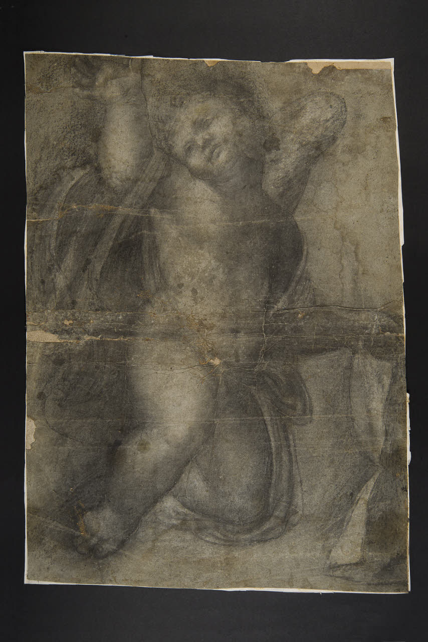 - NOTIZIE STORICO CRITICHE Questo cartone preparatorio rappresenta un raro documento che testimonia la tecnica adottata da Peterzano nel trasporto del disegno in scala reale dalla carta alla superficie pittorica. Ad oggi non si è in grado di rintracciare l'opera per la quale il cartone è stato approntato, ma il modello ricorre spesso nello opere del maestro a partire dai putti affrescati nella controfacciata della chiesa milanese di San Maurizio al Monastero Maggiore. Un simile modello si riscontra anche nella decorazione della cappella di Sant'Antonio nella chiesa di Sant'Angelo a Milano.