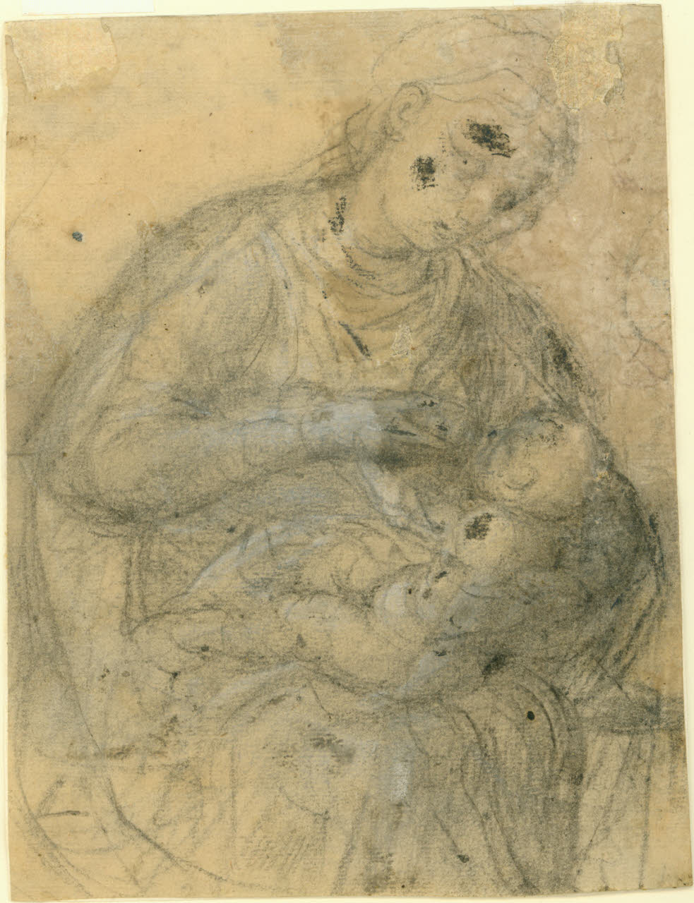 disegno su carta marroncina eseguito a pietra nera naturale con lumeggiature a biacca