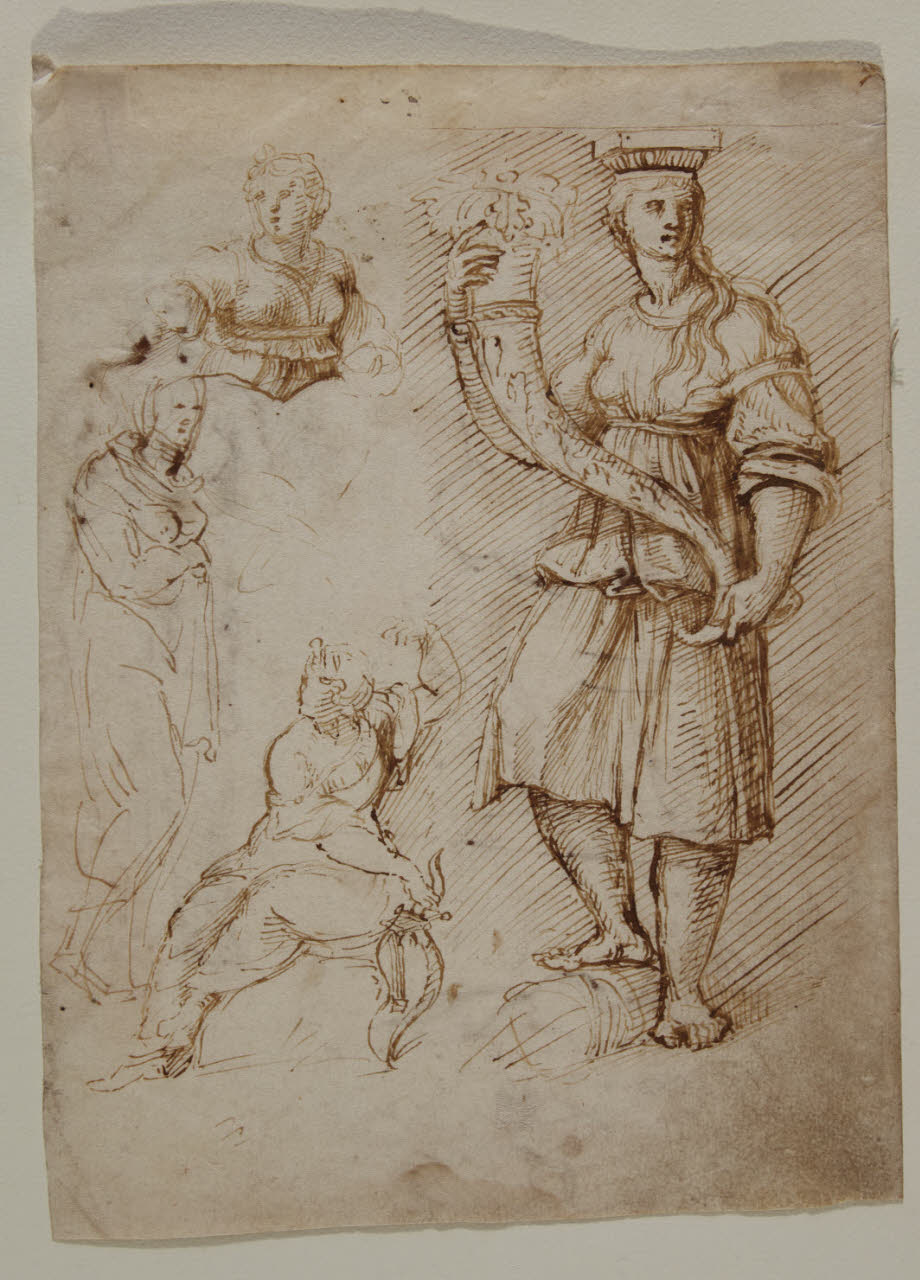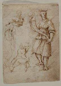 - NOTIZIE STORICO CRITICHE Sono riconoscibili nei dettagli di questo disegno alcuni riferimenti precisi alle Stanze di Raffaello in Vaticano. Il foglio è disegnato su entrambe le facce con registrazioni di particolari dalle scene di Raffaello e bottega e può essere accostato a un altro foglio in collezione, che presenta analoghe scelte iconografiche: sembrano pagine di un taccuino di appunti.
