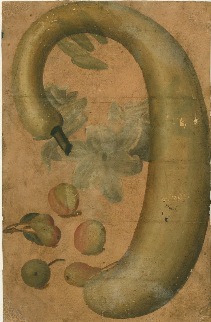 Zucca Lagenaria ricurva, con gigli, pesche e pere. natura morta