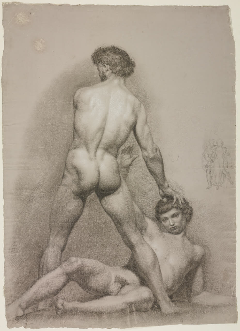 Studio accademico di due nudi virili e bozzetto con figura femminile e maschile