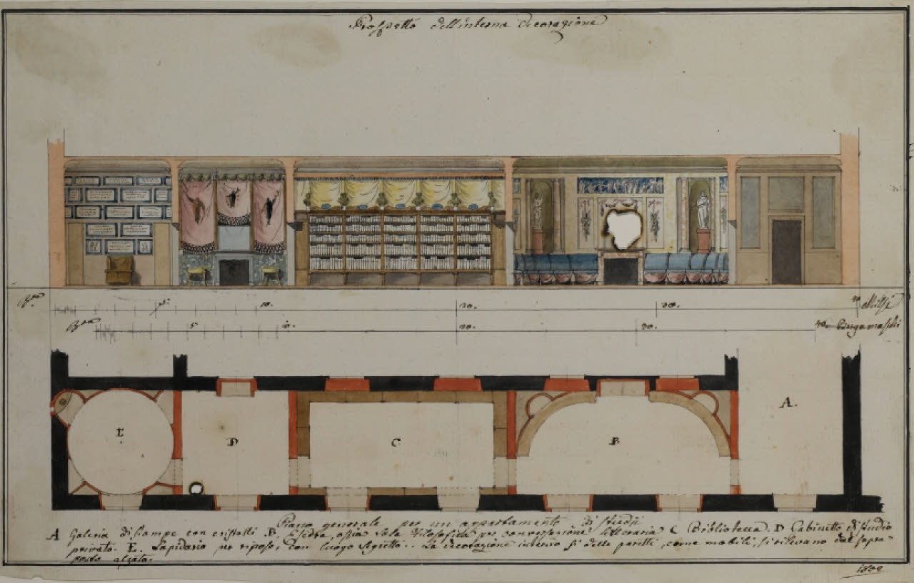 - NOTIZIE STORICO CRITICHE Il disegno è stato eseguito da Leopoldo Pollack come progetto di decorazione per un "Appartamento di Studio", in cui ad ogni lettera corrisponde uno specifico ambiente: A. per la "Galleria di Stampe con cristalli"; B per l'"esedra o sia sala filosofica per conversazione letteraria"; C per la "Biblioteca"; D per il "Gabinetto di Studio privato"; E per il "Lapidario per riposo con luogo segreto".\nL'ambiente raffigurato è collocabile nell'ala a corpo semplice tra la corte e la strada o il giardino, estendendosi per circa 24 metri in uno spazio probabilmente modellato sui gusti e le consuetudini di un collezionista come Alberico di Belgiojoso. Secondo Forni (2020), la doppia scala di misurazione in braccia milanesi e bergamasche farebbe ipotizzare ad una committenza di destinazione differente (identificata nella legenda "A. Galleria di Stampe con cristalli", GDCS B 1870).