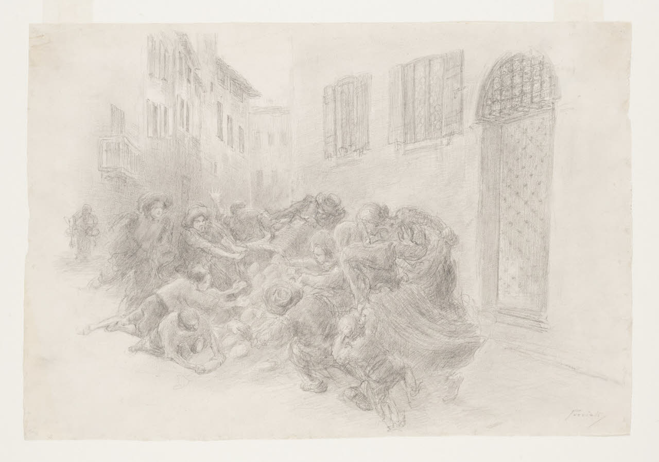 L'assalto ai garzoni dei fornai - "(...) Giù quella gerla, si grida intanto. Molte mani l'afferrano ad un tempo: è a terra". Illustrazione per i Promessi Sposi - Capitolo XII