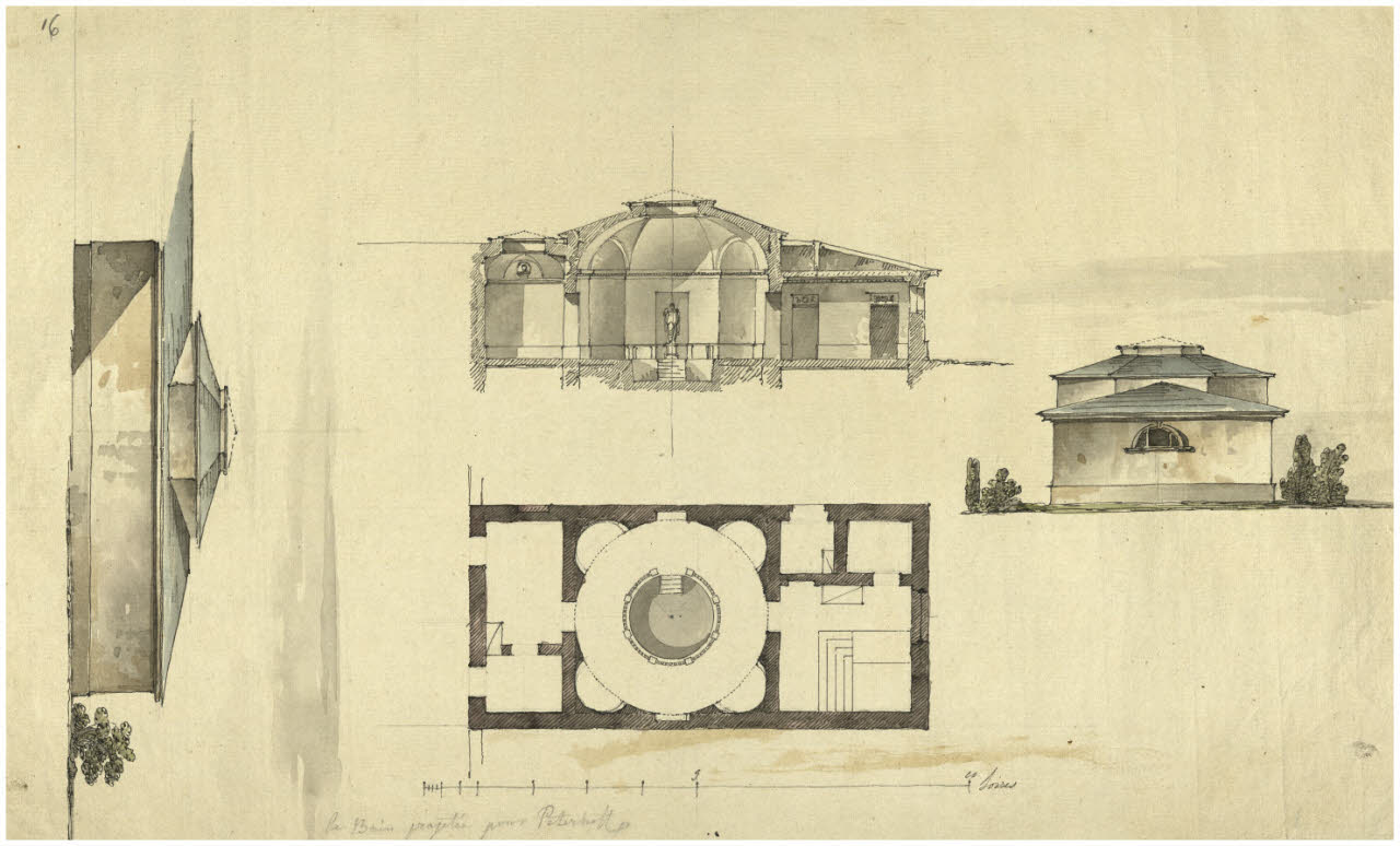 Bagno russo per il parco di Peterhof. Pianta, sezione longitudinale, due prospetti. Bagno russo per il parco di Peterhof. Pianta, sezione longitudinale, due prospetti