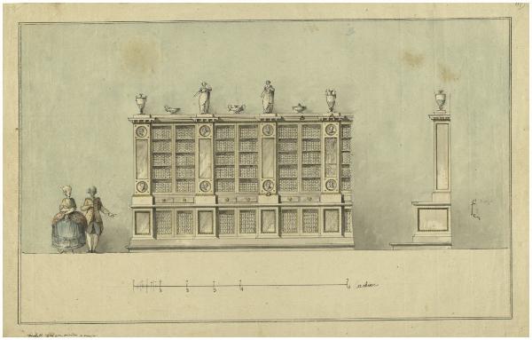 Libreria. Prospetti e particolare di modanatura. Libreria. Prospetti e particolare di modanatura