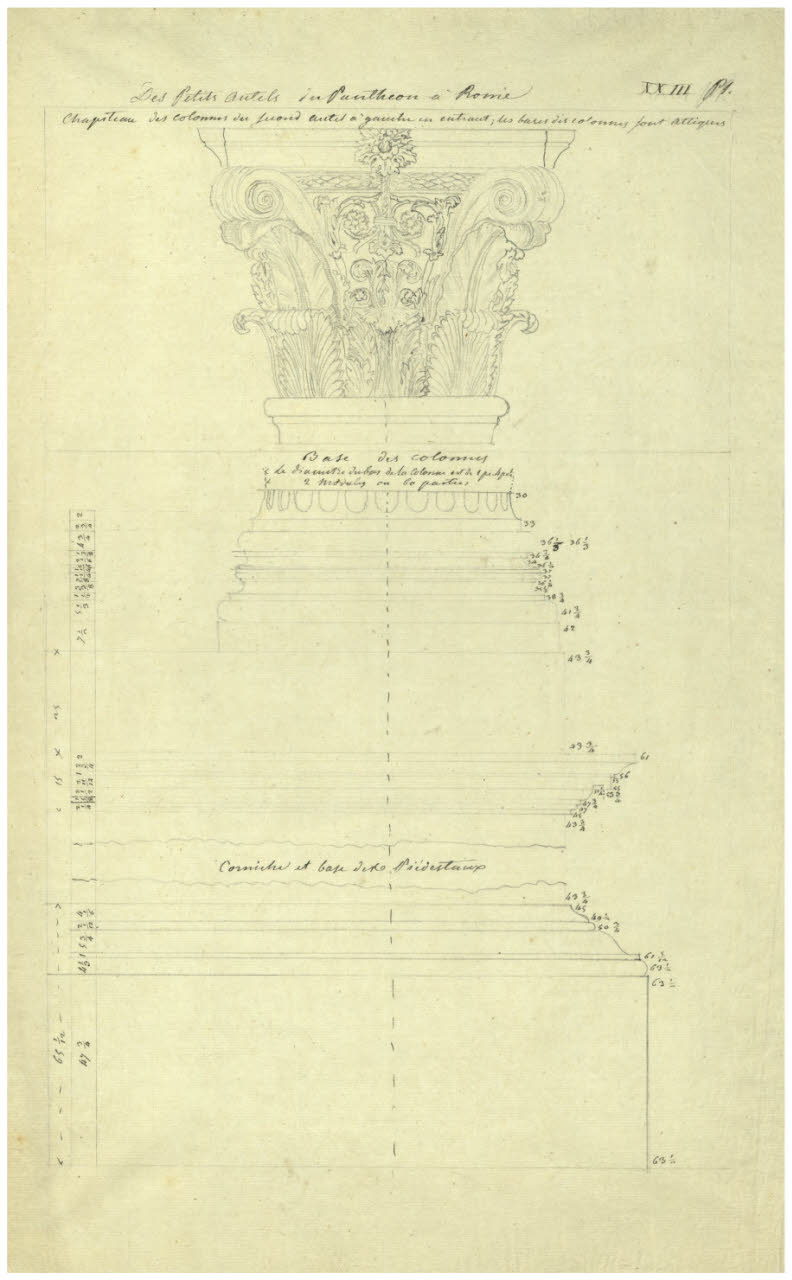 Rilievo del Pantheon (da Les Antiques Edifices de Rome). Ordine architettonico di un'edicola interna. Rilievo del Pantheon (da Les Antiques Edifices de Rome). Ordine architettonico di un'edicola interna