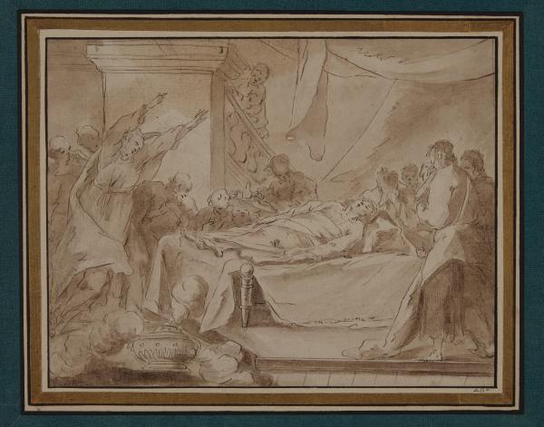 • NOTIZIE STORICO CRITICHE Appartenuto alla collezione del Principe Alberico XII Barbiano di Belgioioso, il foglio entrò nelle collezioni civiche nel 1943 e nell'inventario storico del museo venne ascritto, seppur dubitativamente, a Jean Restout. La scena raffigura un malato disteso su un letto riparato da un pesante drappeggio, al cui capezzale si sono radunate numerose persone, tra cui si riconosce un inserviente che porta su un vassoio alcune ampolle. Ai piedi del letto si avvicina un uomo che impone le mani sul malato, mentre a terra brucia un incensiere, sprigionando volute di fumo. Nell'angolo in basso a sinistra si legge il nome di Restout.
